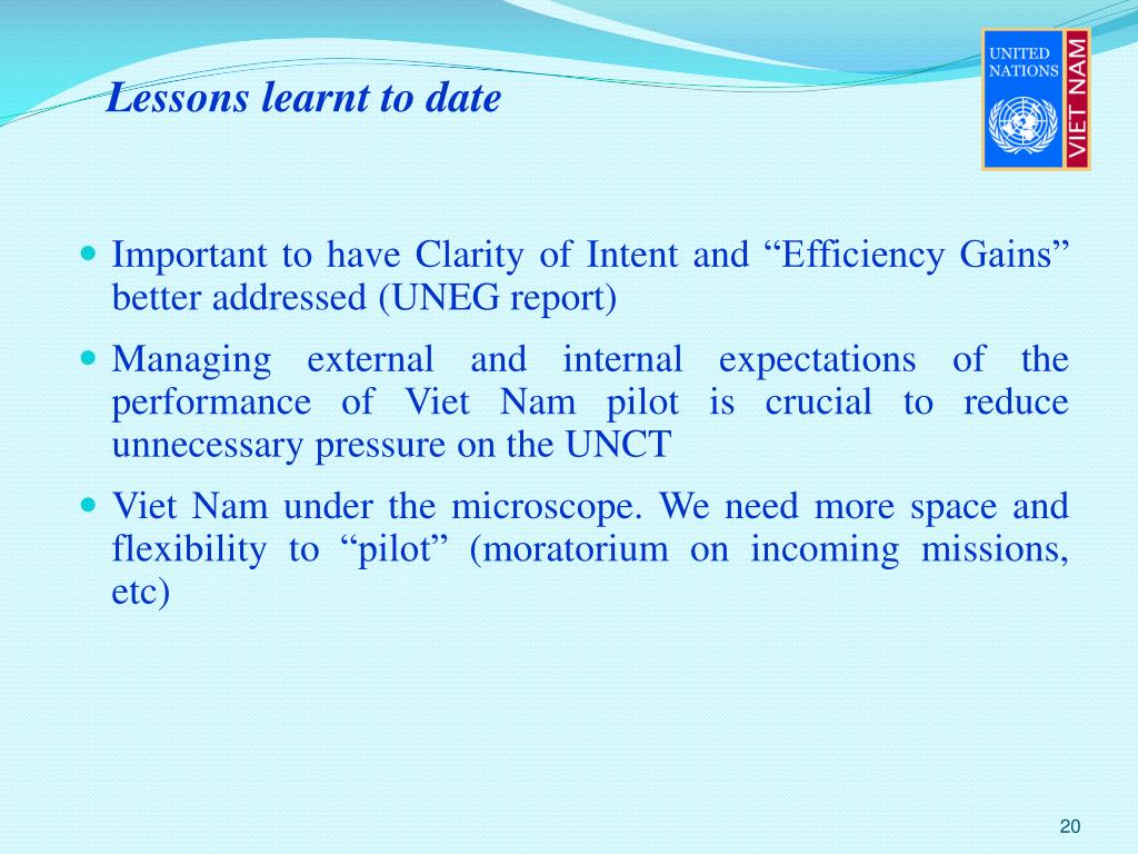 Lessons learnt to date • Important to have Clarity of Intent and “Efficiency Gains” better addressed (UNEG report) • Managing external and internal expectations of the performance of Viet Nam pilot is crucial to reduce unnecessary pressure on the UNCT • Viet Nam under the microscope. We need more space and flexibility to “pilot” (moratorium on incoming missions, etc)