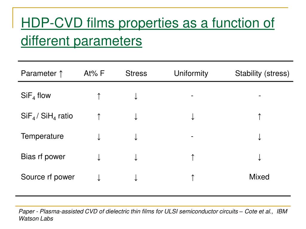 HDP-CVD films properties as a function of different parameters Parameter ↑ At% F Stress Uniformity Stability (stress) SiF4 flow ↑ ↓ - - SiF4 / SiH4 ratio ↑ ↓ ↓ ↑ Temperature ↓ ↓ - ↓ Bias rf power ↓ ↓↑ ↓ Source rf power ↓ ↓↑ Mixed Paper - Plasma-assisted CVD of dielectric thin films for ULSI semiconductor circuits – Cote et al., IBM Watson Labs