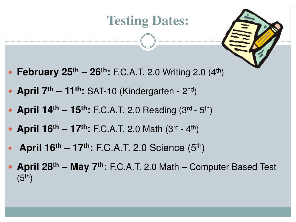 Testing Dates: February 25th– 26th: F.C.A.T. 2.0 Writing 2.0 (4th) April 7th– 11th: SAT-10 (Kindergarten - 2nd) April 14th – 15th: F.C.A.T. 2.0 Reading (3rd - 5th) April 16th – 17th: F.C.A.T. 2.0 Math (3rd - 4th) April 16th– 17th: F.C.A.T. 2.0 Science (5th) April 28th – May 7th: F.C.A.T. 2.0 Math – Computer Based Test (5th)