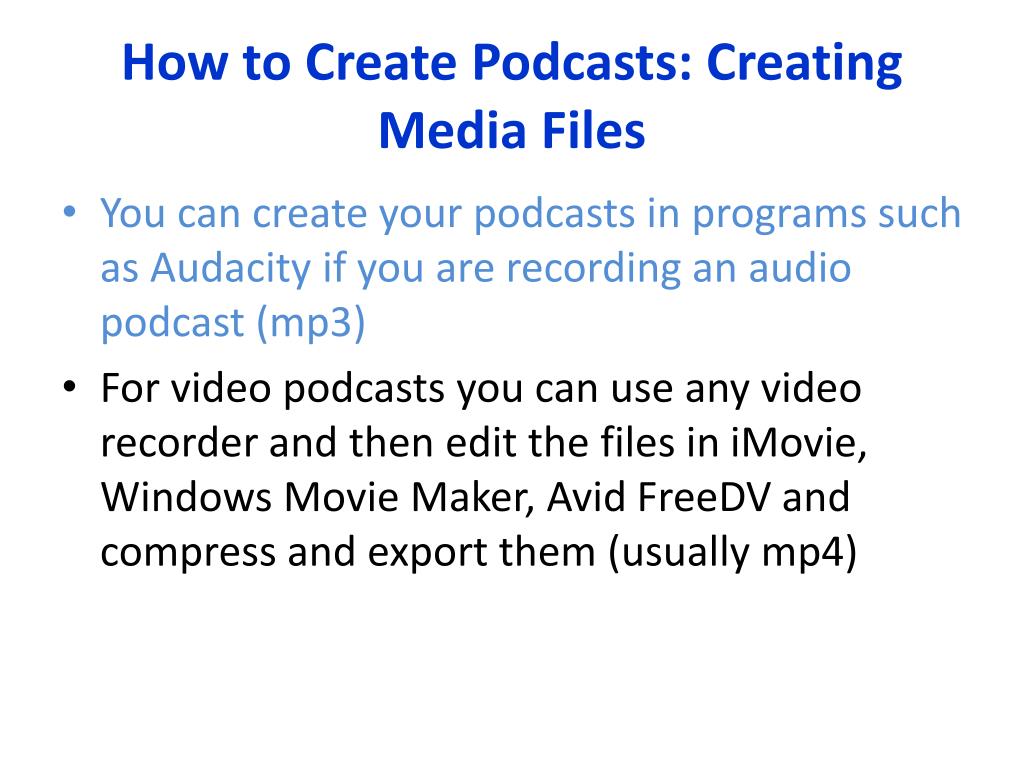 How to Create Podcasts: Creating Media Files • You can create your podcasts in programs such as Audacity if you are recording an audio podcast (mp3) • For video podcasts you can use any video recorder and then edit the files in iMovie, Windows Movie Maker, Avid FreeDV and compress and export them (usually mp4)