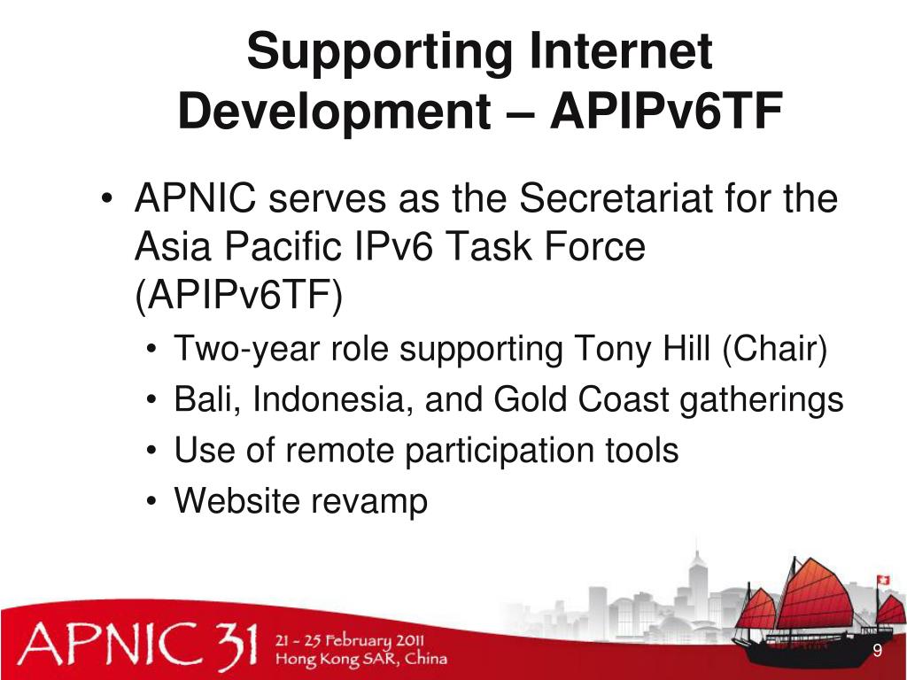 Supporting Internet Development – APIPv6TF • APNIC serves as the Secretariat for the Asia Pacific IPv6 Task Force (APIPv6TF) • Two-year role supporting Tony Hill (Chair) • Bali, Indonesia, and Gold Coast gatherings • Use of remote participation tools • Website revamp