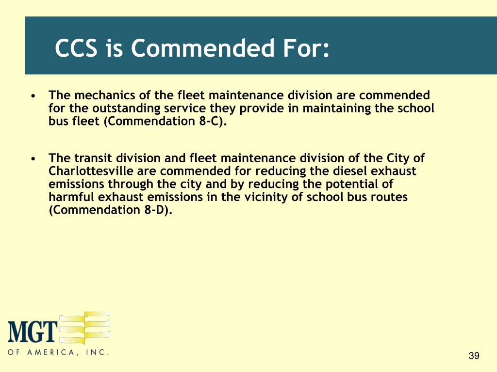 CCS is Commended For: • The mechanics of the fleet maintenance division are commended for the outstanding service they provide in maintaining the school bus fleet (Commendation 8-C). • The transit division and fleet maintenance division of the City of Charlottesville are commended for reducing the diesel exhaust emissions through the city and by reducing the potential of harmful exhaust emissions in the vicinity of school bus routes (Commendation 8-D).