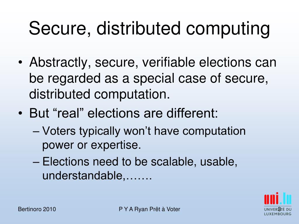 Secure, distributed computing • Abstractly, secure, verifiable elections can be regarded as a special case of secure, distributed computation. • But “real” elections are different: • Voters typically won’t have computation power or expertise. • Elections need to be scalable, usable, understandable,……. P Y A Ryan Prêt à Voter