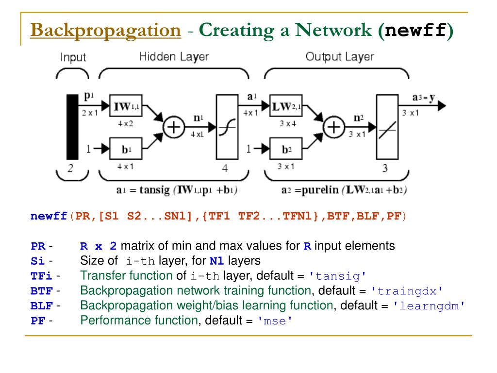 Backpropagation - Creating a Network (newff) newff(PR,[S1 S2...SNl],{TF1 TF2...TFNl},BTF,BLF,PF) PR - R x 2 matrix of min and max values for R input elements Si - Size of i-th layer, for Nl layers TFi - Transfer function of i-th layer, default = 'tansig' BTF - Backpropagation network training function, default = 'traingdx' BLF - Backpropagation weight/bias learning function, default = 'learngdm' PF - Performance function, default = 'mse'