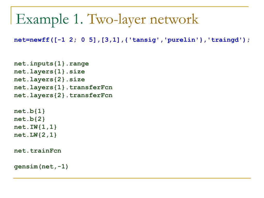 Example 1. Two-layer network net=newff([-1 2; 0 5],[3,1],{'tansig','purelin'},'traingd'); net.inputs{1}.range net.layers{1}.size net.layers{2}.size net.layers{1}.transferFcn net.layers{2}.transferFcn net.b{1} net.b{2} net.IW{1,1} net.LW{2,1} net.trainFcn gensim(net,-1)