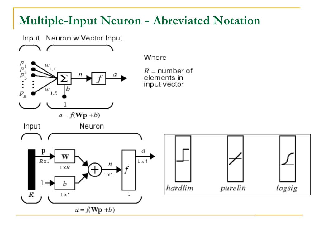 p b a 1 1 1 p b a p b a 2 2 2 = = = p b a R S S Layer of Neurons - Abreviated Notation w w ¼ w 1 , 1 1 , 2 1 , R w w ¼ w 2 , 1 2 , 2 2 , R W = w w ¼ w S , 1 S , 2 S , R
