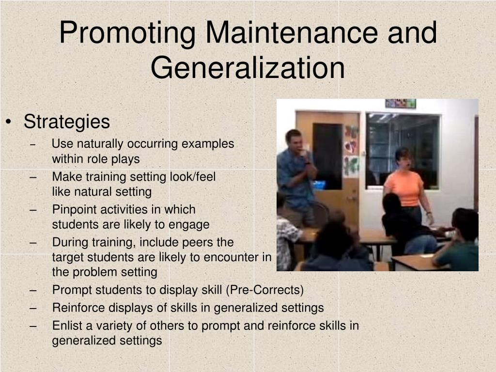Promoting Maintenance and Generalization • Strategies • Use naturally occurring examples within role plays • Make training setting look/feel like natural setting • Pinpoint activities in which students are likely to engage • During training, include peers the target students are likely to encounter in the problem setting • Prompt students to display skill (Pre-Corrects) • Reinforce displays of skills in generalized settings • Enlist a variety of others to prompt and reinforce skills in generalized settings