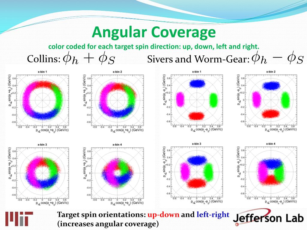 Angular Coveragecolor coded for each target spin direction: up, down, left and right. Collins: Sivers and Worm-Gear: Target spin orientations: up-downand left-right (increases angular coverage)