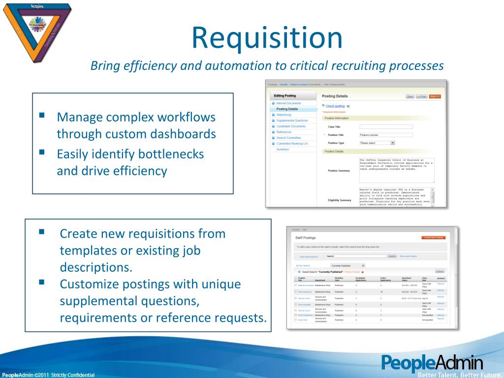 RequisitionBring efficiency and automation to critical recruiting processes • Manage complex workflows through custom dashboards • Easily identify bottlenecks and drive efficiency • Create new requisitions from templates or existing job descriptions. • Customize postings with unique supplemental questions, requirements or reference requests.
