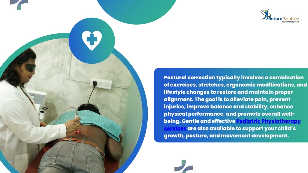 Postural correction typically involves a combination of exercises, stretches, ergonomic modifications, and lifestyle changes to restore and maintain proper alignment. The goal is to alleviate pain, prevent injuries, improve balance and stability, enhance physical performance, and promote overall well-being. Gentle and effective Pediatric Physiotherapy services are also available to support your child’s growth, posture, and movement development.