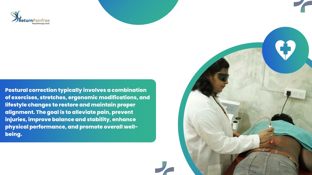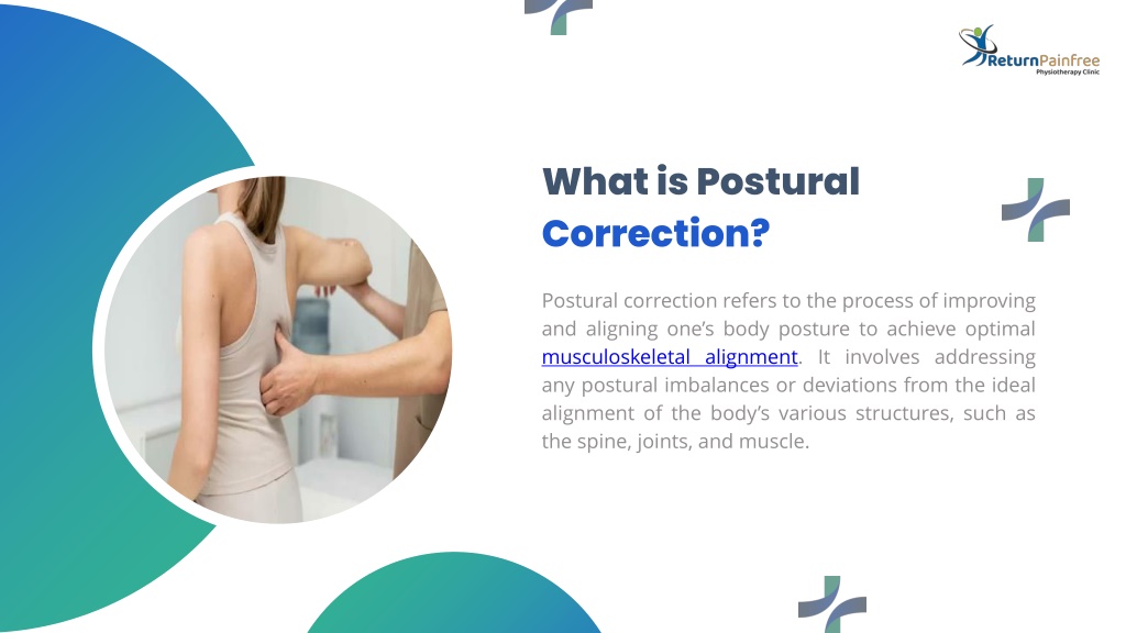 What is Postural • Correction? • Postural correction refers to the process of improving and aligning one’s body posture to achieve optimal musculoskeletal alignment. It involves addressing any postural imbalances or deviations from the ideal alignment of the body’s various structures, such as the spine, joints, and muscle.