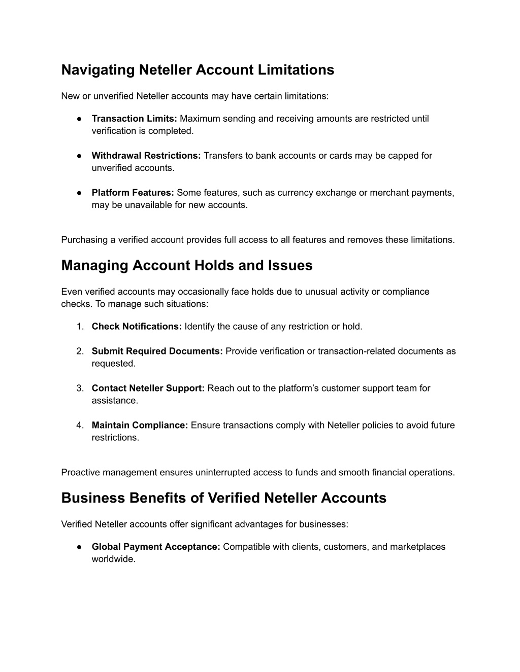 Navigating Neteller Account Limitations New or unverified Neteller accounts may have certain limitations: ● Transaction Limits: Maximum sending and receiving amounts are restricted until verification is completed. ● Withdrawal Restrictions: Transfers to bank accounts or cards may be capped for unverified accounts. ● Platform Features: Some features, such as currency exchange or merchant payments, may be unavailable for new accounts. Purchasing a verified account provides full access to all features and removes these limitations. Managing Account Holds and Issues Even verified accounts may occasionally face holds due to unusual activity or compliance checks. To manage such situations: 1. Check Notifications: Identify the cause of any restriction or hold. 2. Submit Required Documents: Provide verification or transaction-related documents as requested. 3. Contact Neteller Support: Reach out to the platform’s customer support team for assistance. 4. Maintain Compliance: Ensure transactions comply with Neteller policies to avoid future restrictions. Proactive management ensures uninterrupted access to funds and smooth financial operations. Business Benefits of Verified Neteller Accounts Verified Neteller accounts offer significant advantages for businesses: ● Global Payment Acceptance: Compatible with clients, customers, and marketplaces worldwide.