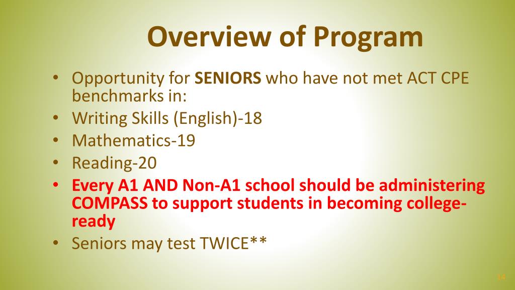 Overview of Program • Opportunity for SENIORS who have not met ACT CPE benchmarks in: • Writing Skills (English)-18 • Mathematics-19 • Reading-20 • Every A1 AND Non-A1 school should be administering COMPASS to support students in becoming college-ready • Seniors may test TWICE**