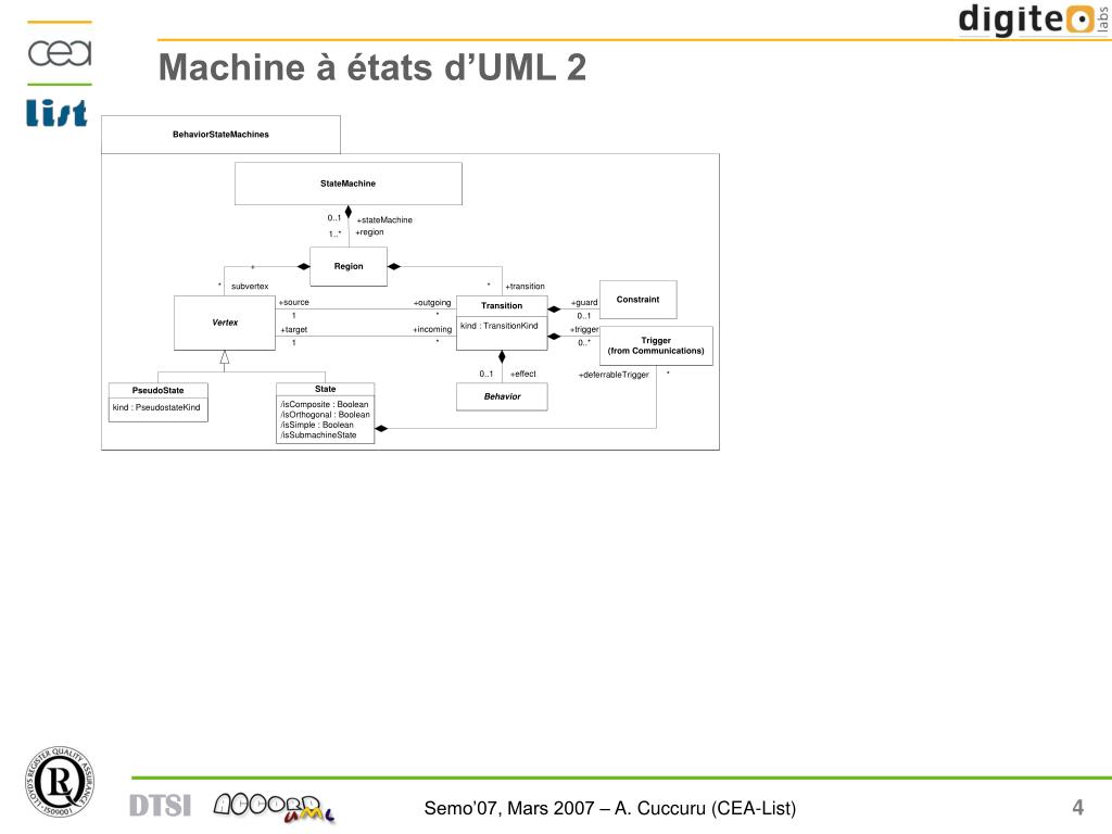 Sommaire • Machines à états d’UML 2 • Spécialisation avec les mécanismes du MOF • Profile • Extension • Merge • Spécialisation dans les approches “opérationnelles” • Extension • Surcharge • Proposition • Identification par paramètres template • Modularisation par le pattern “strategy” • Fixation par liaison des paramètres • Conclusion