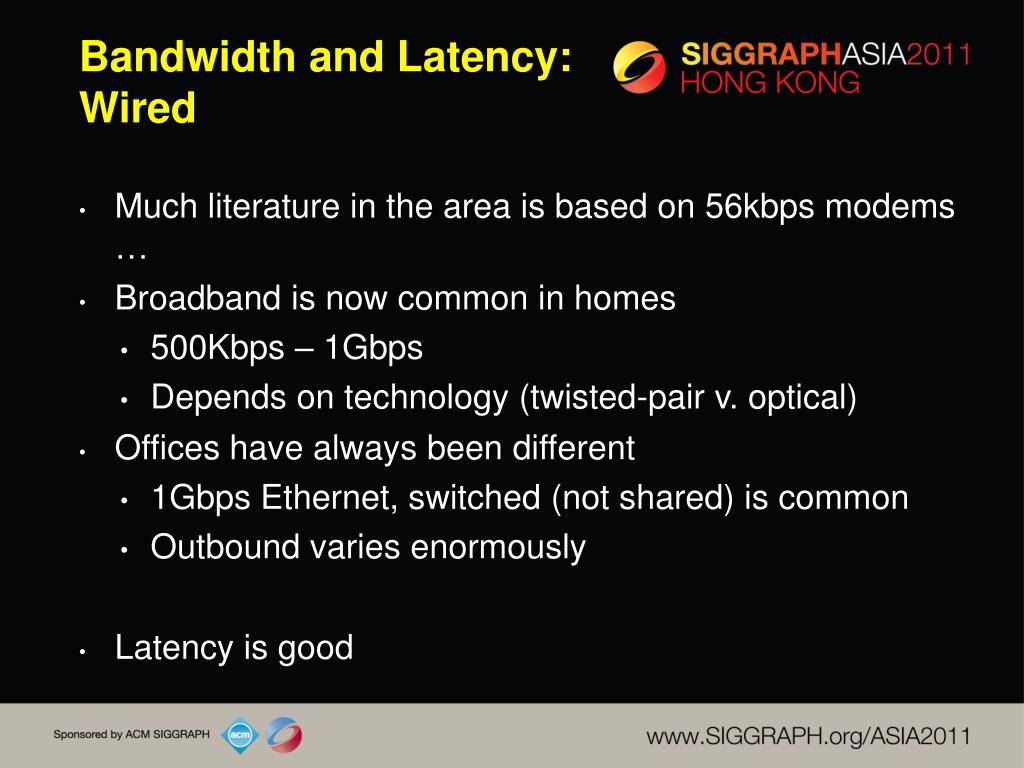Bandwidth and Latency: Wired • Much literature in the area is based on 56kbps modems … • Broadband is now common in homes • 500Kbps – 1Gbps • Depends on technology (twisted-pair v. optical) • Offices have always been different • 1Gbps Ethernet, switched (not shared) is common • Outbound varies enormously • Latency is good