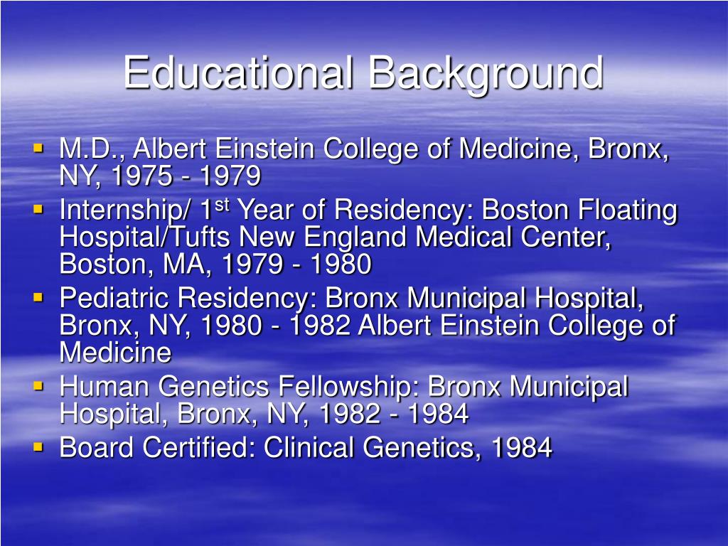 Educational Background • M.D., Albert Einstein College of Medicine, Bronx, NY, 1975 - 1979 • Internship/ 1st Year of Residency: Boston Floating Hospital/Tufts New England Medical Center, Boston, MA, 1979 - 1980 • Pediatric Residency: Bronx Municipal Hospital, Bronx, NY, 1980 - 1982 Albert Einstein College of Medicine • Human Genetics Fellowship: Bronx Municipal Hospital, Bronx, NY, 1982 - 1984 • Board Certified: Clinical Genetics, 1984