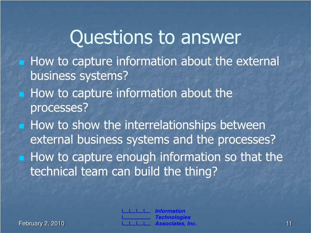 Questions to answer • How to capture information about the external business systems? • How to capture information about the processes? • How to show the interrelationships between external business systems and the processes? • How to capture enough information so that the technical team can build the thing?