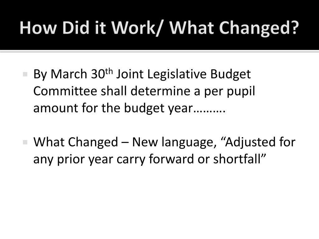 How Did it Work/ What Changed? • By March 30th Joint Legislative Budget Committee shall determine a per pupil amount for the budget year………. • What Changed – New language, “Adjusted for any prior year carry forward or shortfall”