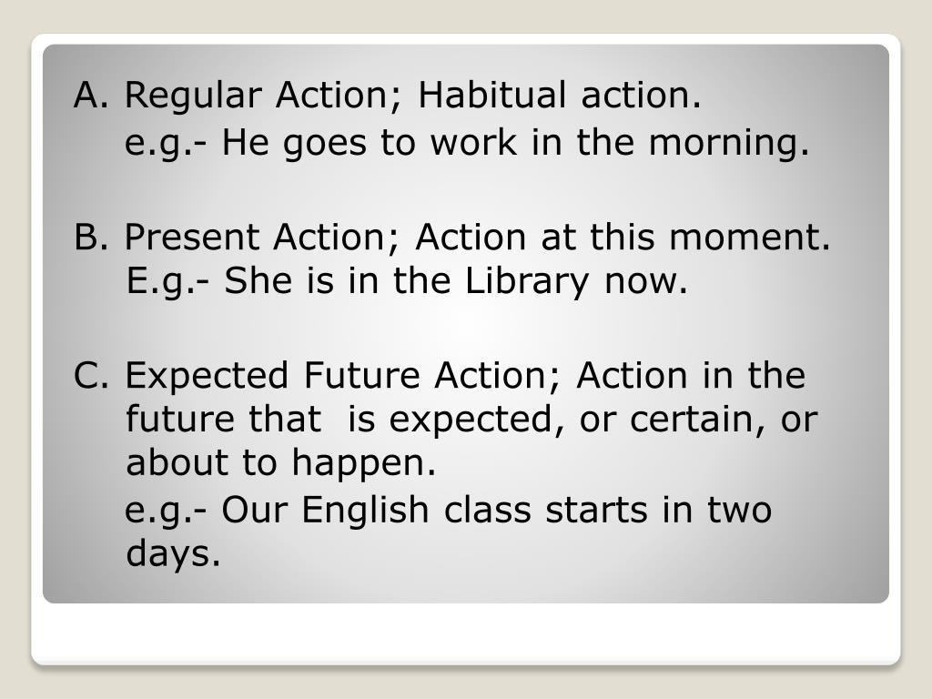 A. Regular Action; Habitual action. e.g.- He goes to work in the morning. B. Present Action; Action at this moment. E.g.- She is in the Library now. C. Expected Future Action; Action in the future that is expected, or certain, or about to happen. e.g.- Our English class starts in two days.