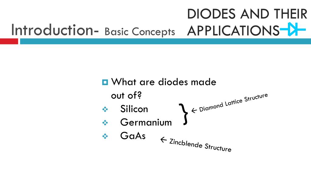 DIODES AND THEIR APPLICATIONS Introduction- Basic Concepts • What are diodes made out of? • Silicon • Germanium • GaAs } Diamond Lattice Structure Zincblende Structure