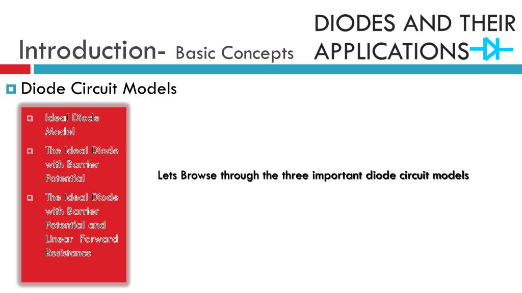 DIODES AND THEIR APPLICATIONS Introduction- Basic Concepts • Diode Circuit Models • Ideal Diode Model • The Ideal Diode with Barrier Potential • The Ideal Diode with Barrier Potential and Linear Forward Resistance Lets Browse through the three important diode circuit models