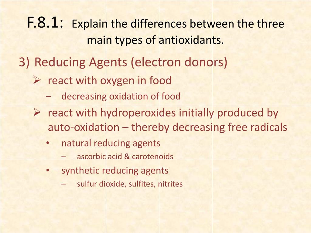 F.8.1: Explain the differences between the three main types of antioxidants. 3) Reducing Agents (electron donors) • react with oxygen in food • decreasing oxidation of food • react with hydroperoxides initially produced by auto-oxidation – thereby decreasing free radicals • natural reducing agents • ascorbic acid & carotenoids • synthetic reducing agents • sulfur dioxide, sulfites, nitrites