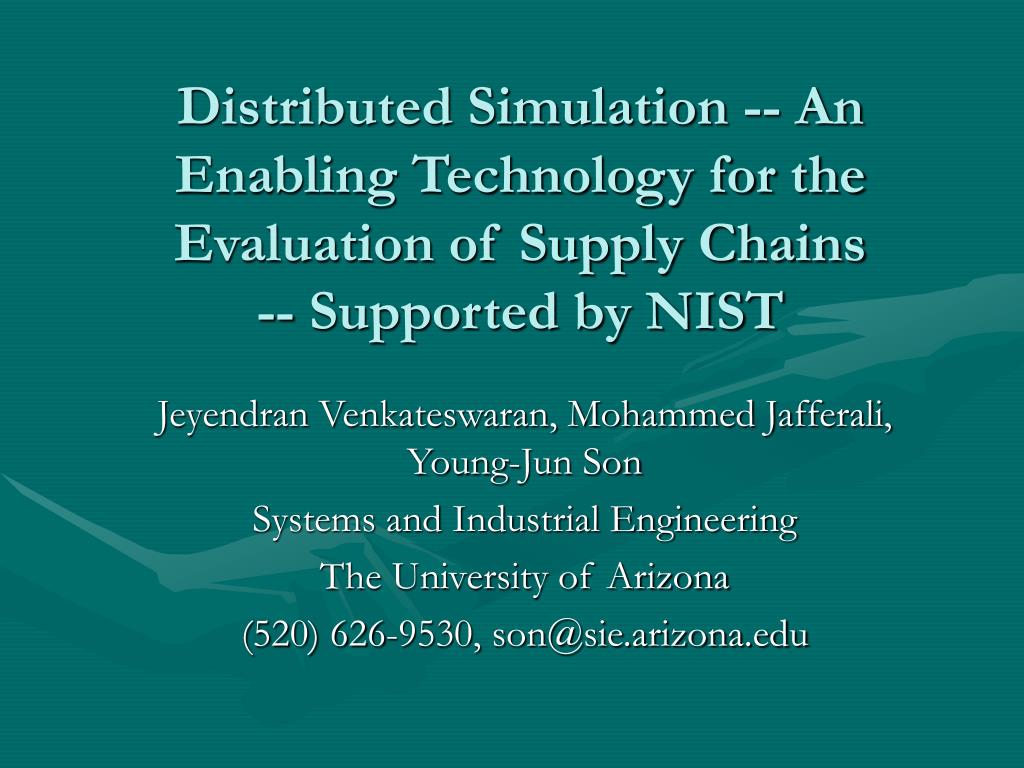 Distributed Simulation -- An Enabling Technology for the Evaluation of Supply Chains-- Supported by NIST Jeyendran Venkateswaran, Mohammed Jafferali, Young-Jun Son Systems and Industrial Engineering The University of Arizona (520) 626-9530, son@sie.arizona.edu