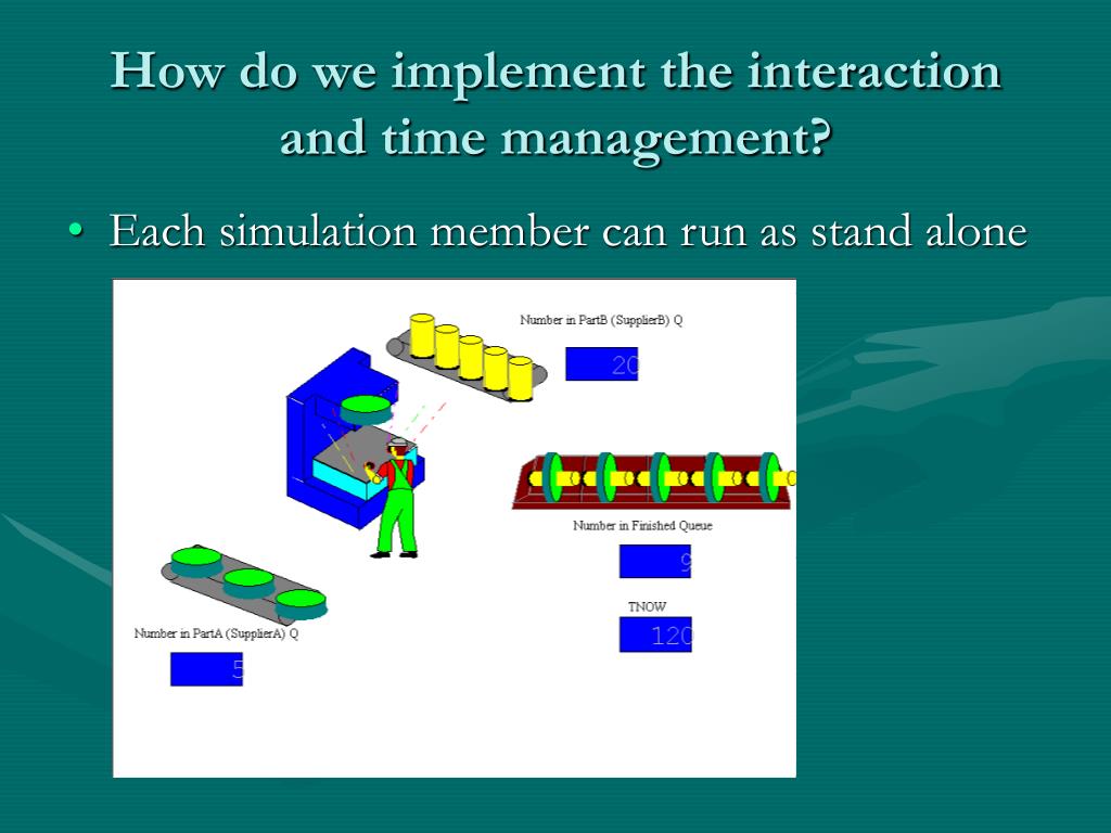 How do we implement the interactionand time management? • Each simulation member can run as stand alone