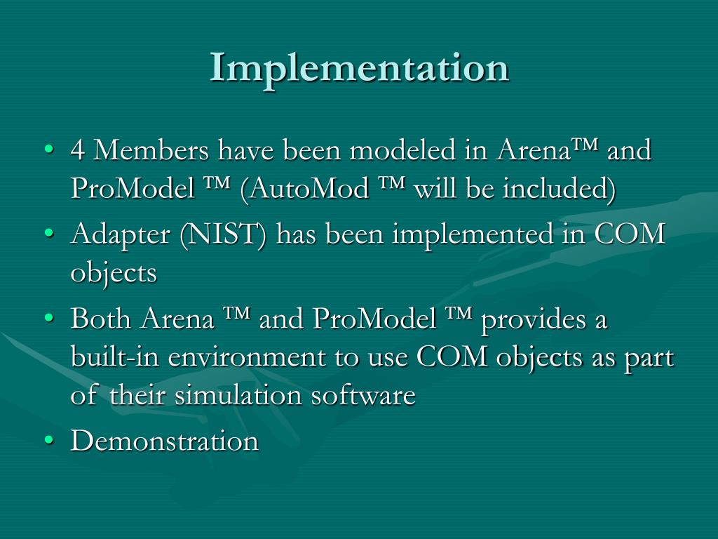 Implementation • 4 Members have been modeled in Arena and ProModel (AutoMod will be included) • Adapter (NIST) has been implemented in COM objects • Both Arena and ProModel provides a built-in environment to use COM objects as part of their simulation software • Demonstration