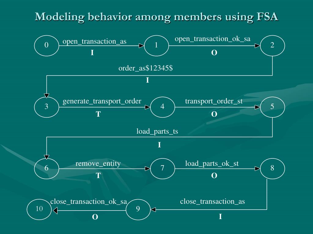 Modeling behavior among members using FSA open_transaction_ok_sa open_transaction_as 0 1 2 I O order_as$12345$ I generate_transport_order transport_order_st 3 4 5 T O load_parts_ts I remove_entity load_parts_ok_st 6 7 8 T O close_transaction_as close_transaction_ok_sa 10 9 I O