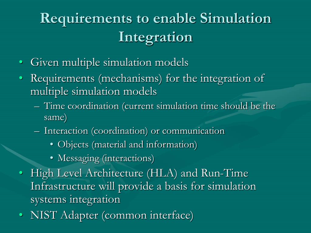 Requirements to enable Simulation Integration • Given multiple simulation models • Requirements (mechanisms) for the integration of multiple simulation models • Time coordination (current simulation time should be the same) • Interaction (coordination) or communication • Objects (material and information) • Messaging (interactions) • High Level Architecture (HLA) and Run-Time Infrastructure will provide a basis for simulation systems integration • NIST Adapter (common interface)