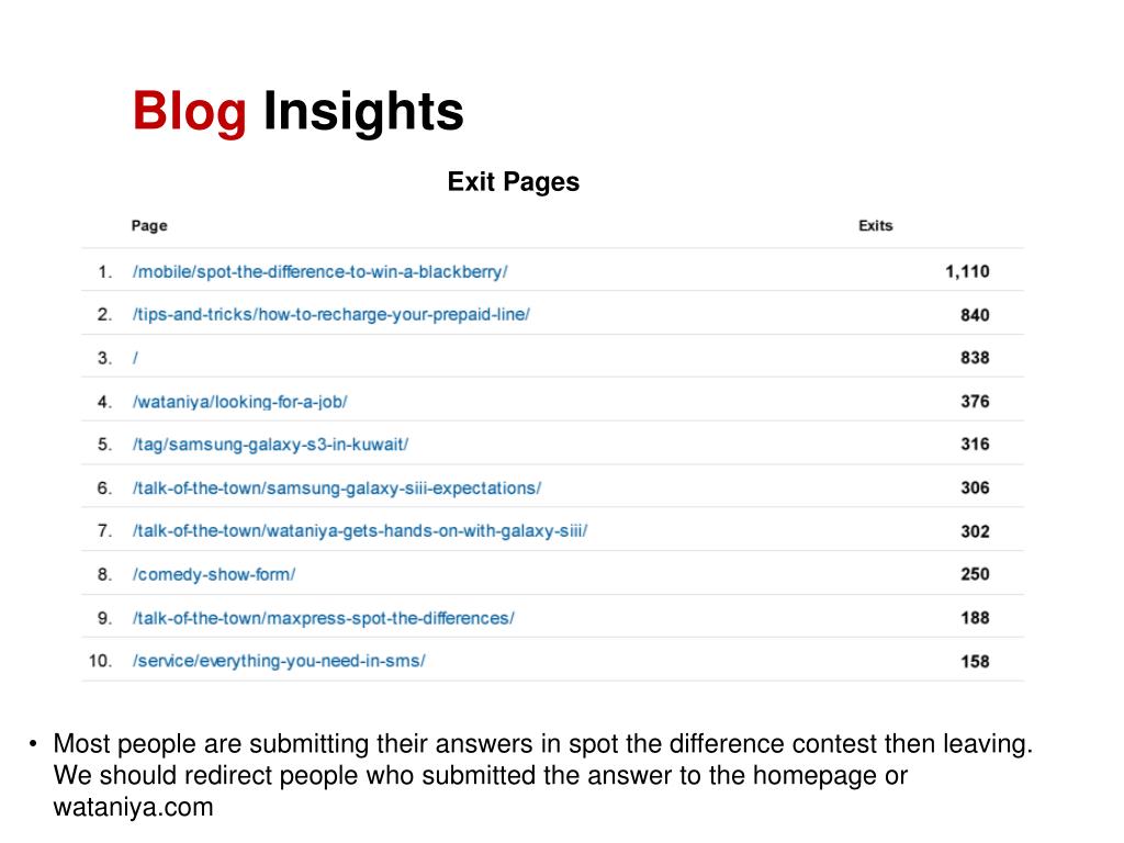 Exit Pages Blog Insights • Most people are submitting their answers in spot the difference contest then leaving. We should redirect people who submitted the answer to the homepage or wataniya.com