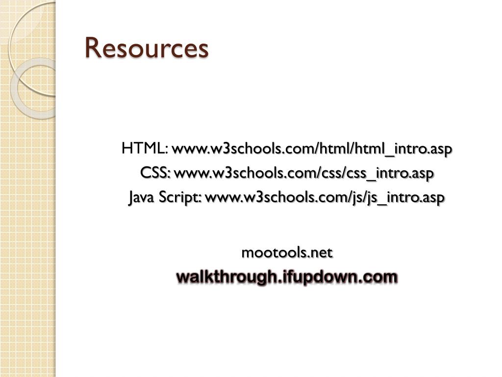 Resources HTML: www.w3schools.com/html/html_intro.asp CSS: www.w3schools.com/css/css_intro.asp Java Script: www.w3schools.com/js/js_intro.asp mootools.net walkthrough.ifupdown.com