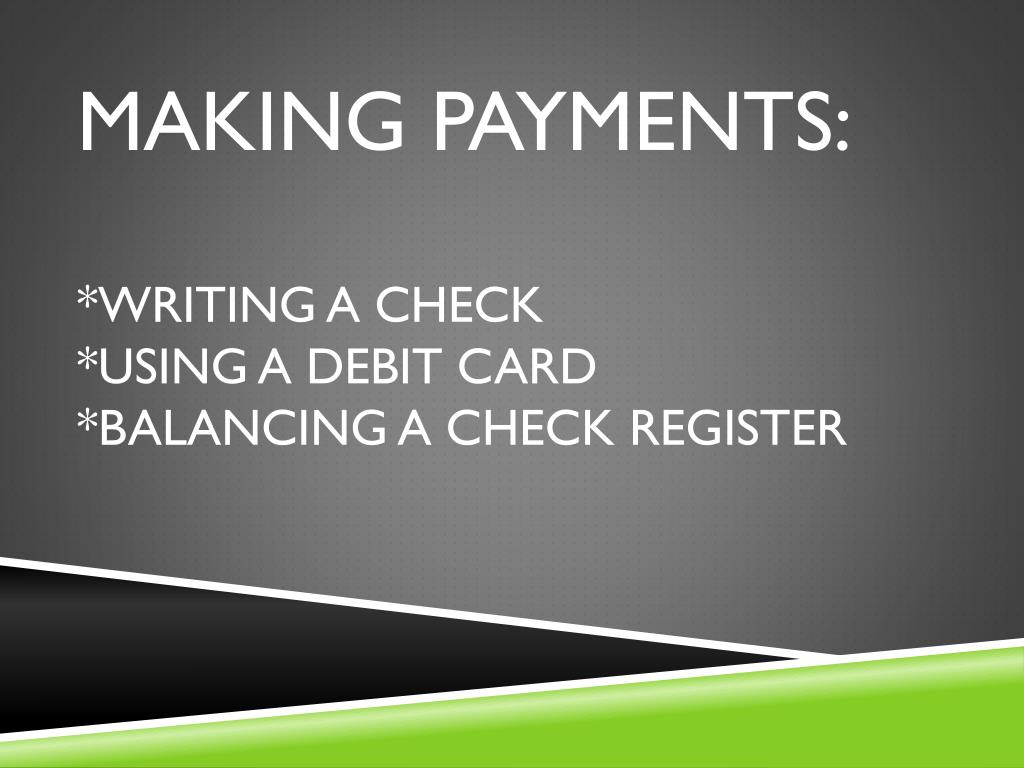 Making payments:*Writing a check*using a debit card*balancing a check register