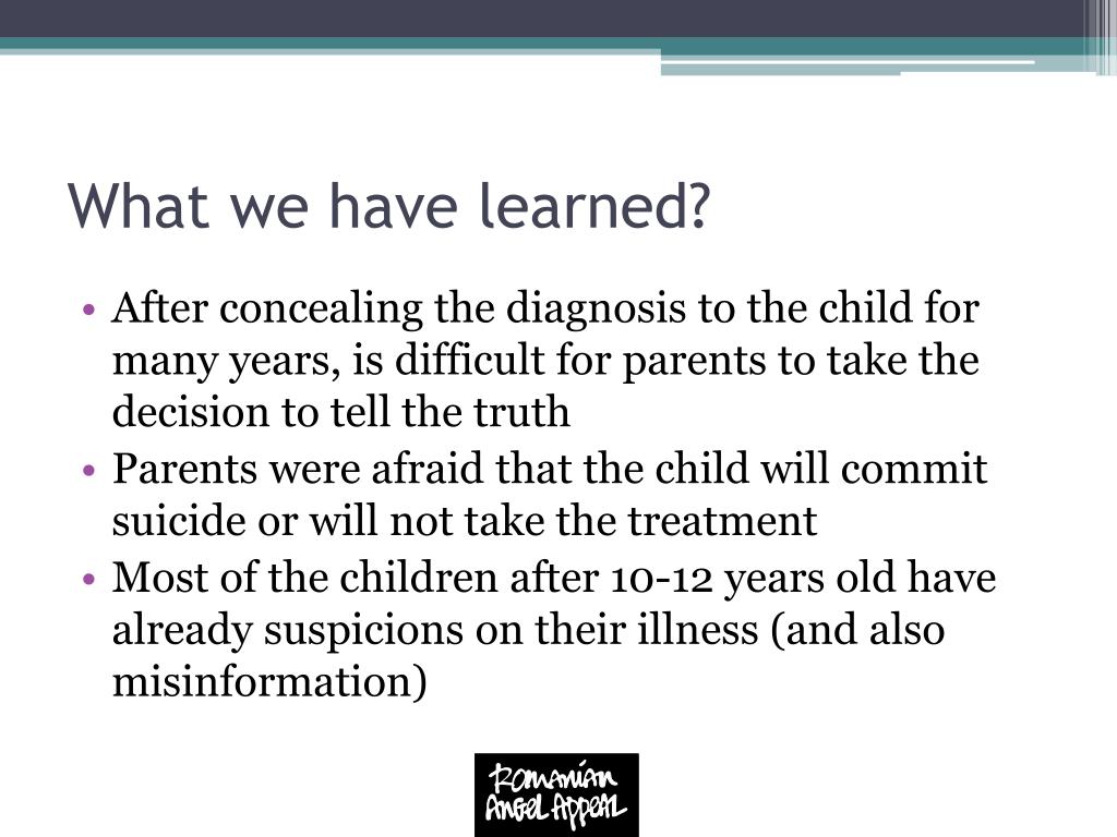 What we have learned? • After concealing the diagnosis to the child for many years, is difficult for parents to take the decision to tell the truth • Parents were afraid that the child will commit suicide or will not take the treatment • Most of the children after 10-12 years old have already suspicions on their illness (and also misinformation)