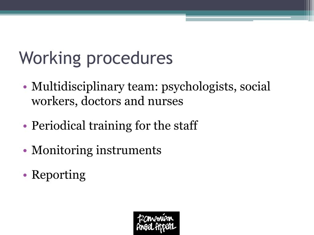 Working procedures • Multidisciplinary team: psychologists, social workers, doctors and nurses • Periodical training for the staff • Monitoring instruments • Reporting