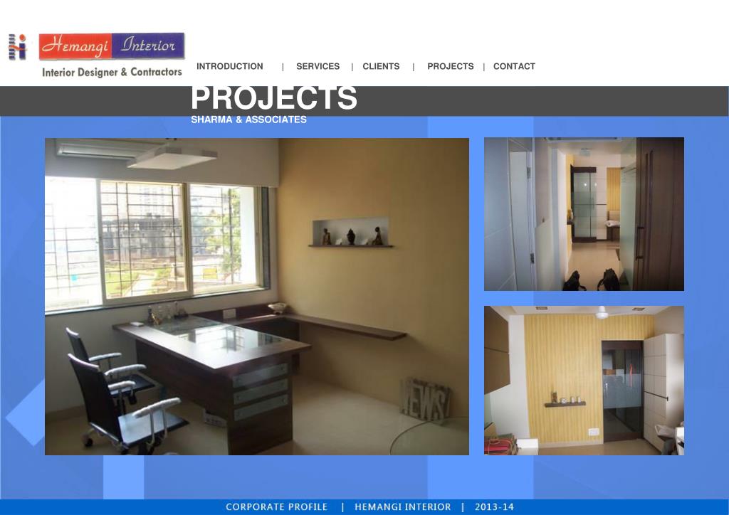 CONTACT US Hemangi Interior Contact Persons: Mr. Narendra Mistry + 91-93242 33447 / 98209 73975 Mr. Bharat Mistry +91-98197 73975 Mr. Chandrakant Suthar +91-99202 64097 Head Office Address : Shukla Comp, Shop No.75, Near Gokulanand Hotel, Pavan Nagar, Ashokvan, Dahisar (East), Mumbai - 400 068. Tele Fax. : 022 - 2897 8267 Mob. : 093242 33447 098209 73975 Branch Office Surat : Sita Palace 302, Parvat Patia, Ganesh Nagar, Magod, Surat - 395 010 Email : hemangiinterior@gmail.com info@hemangiinterior.com CORPORATE PROFILE | HEMANGI INTERIOR | 2013