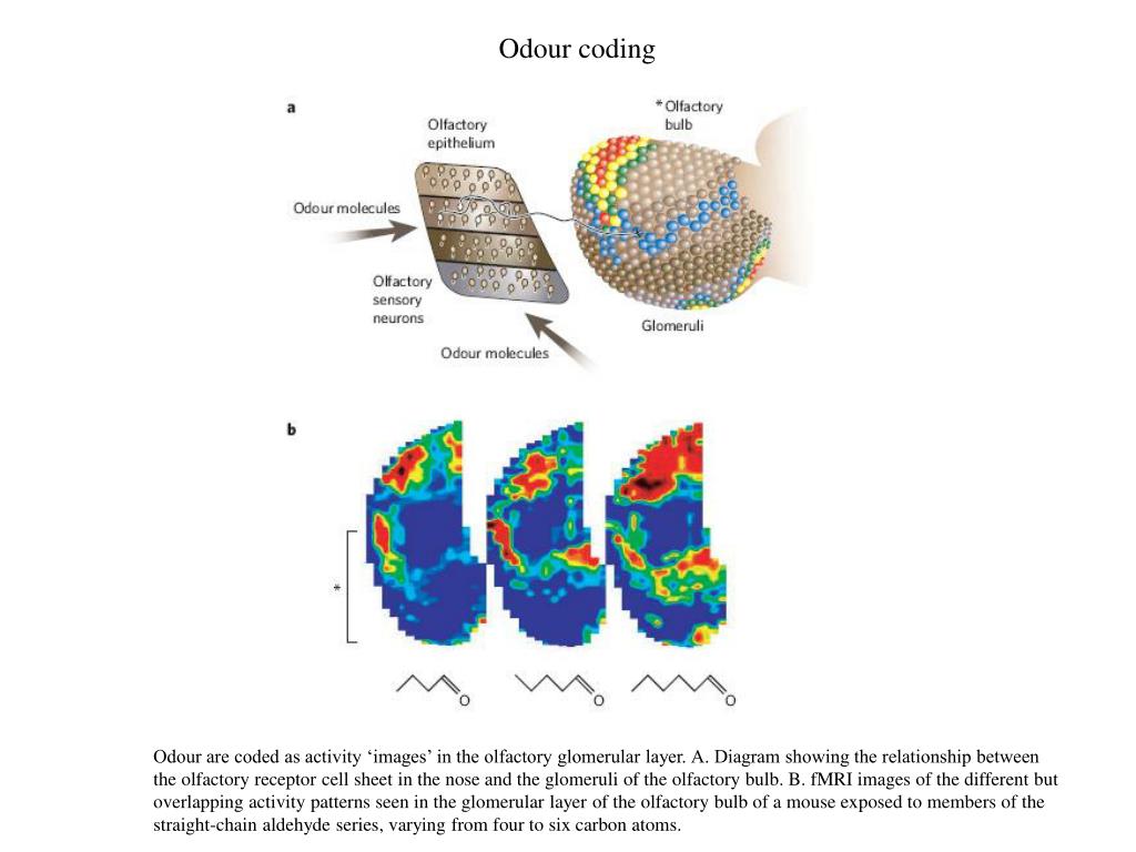 Odour coding Odour are coded as activity ‘images’ in the olfactory glomerular layer. A. Diagram showing the relationship between the olfactory receptor cell sheet in the nose and the glomeruli of the olfactory bulb. B. fMRI images of the different but overlapping activity patterns seen in the glomerular layer of the olfactory bulb of a mouse exposed to members of the straight-chain aldehyde series, varying from four to six carbon atoms.