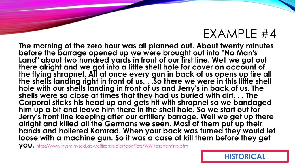 Example #4 The morning of the zero hour was all planned out. About twenty minutes before the barrage opened up we were brought out into "No Man's Land" about two hundred yards in front of our first line. Well we got out there alright and we got into a little shell hole for cover on account of the flying shrapnel. All at once every gun in back of us opens up fire all the shells landing right in front of us. . .So there we were in this little shell hole with our shells landing in front of us and Jerry's in back of us. The shells were so close at times that they had us buried with dirt. . . The Corporal sticks his head up and gets hit with shrapnel so we bandaged him up a bit and leave him there in the shell hole. So we start out for Jerry's front line keeping after our artillery barrage. Well we get up there alright and killed all the Germans we seen. Most of them put up their hands and hollered Kamrad. When your back was turned they would let loose with a machine gun. So it was a case of kill them before they get you. http://www.nysm.nysed.gov/citizensoldier/conflicts/WWI/pschaming.cfm HISTORICAL