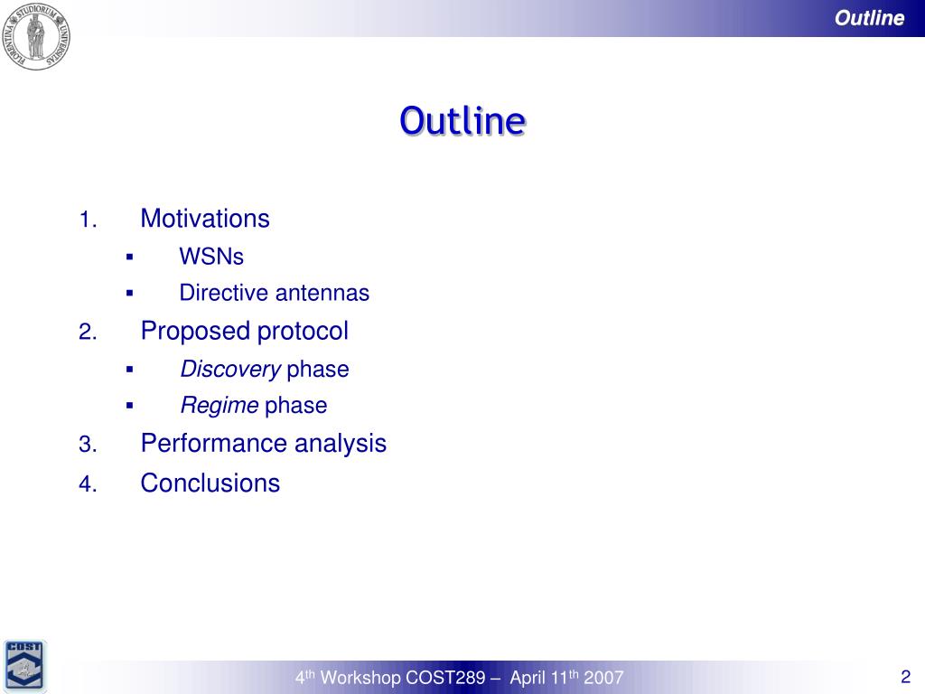 Outline Outline • Motivations • WSNs • Directive antennas • Proposed protocol • Discovery phase • Regime phase • Performance analysis • Conclusions