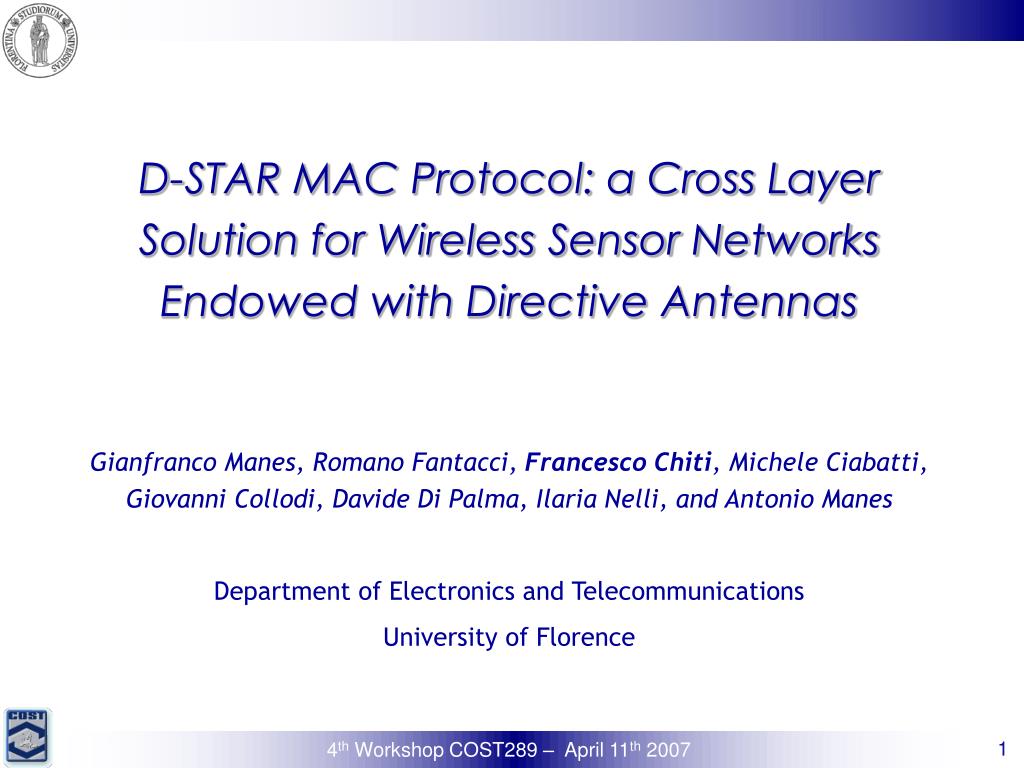 D-STAR MAC Protocol: a Cross Layer Solution for Wireless Sensor Networks Endowed with Directive Antennas Gianfranco Manes, Romano Fantacci, Francesco Chiti , Michele Ciabatti, Giovanni Collodi, Davide Di Palma, Ilaria Nelli, and Antonio Manes Department of Electronics and Telecommunications