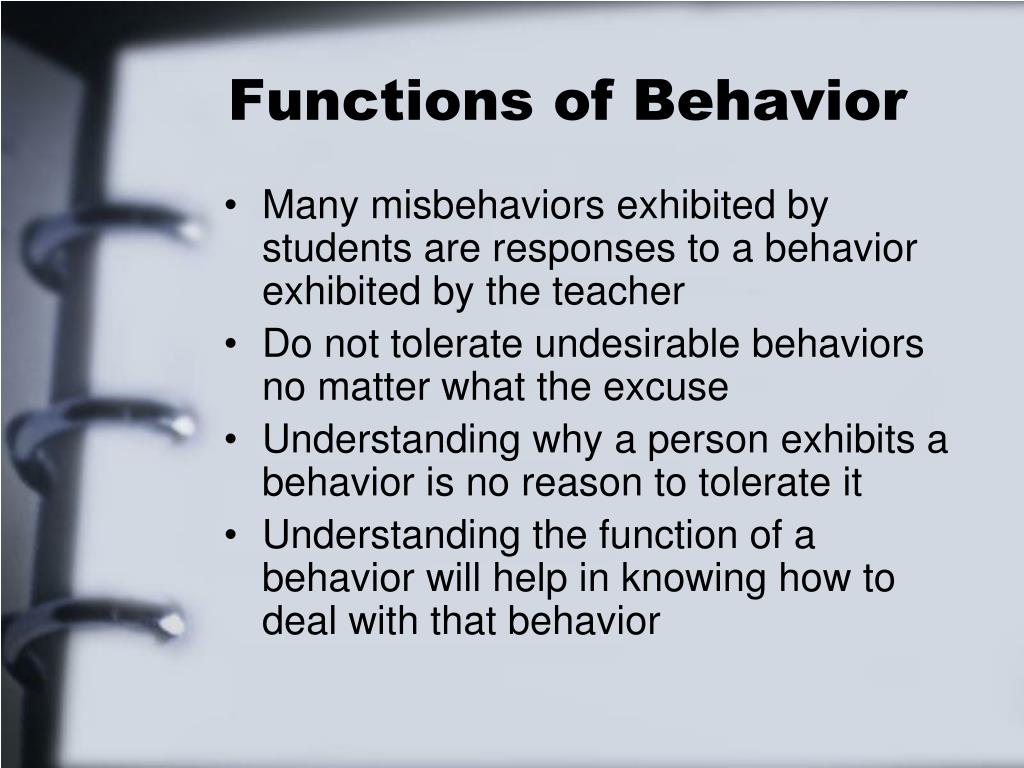 Functions of Behavior • Many misbehaviors exhibited by students are responses to a behavior exhibited by the teacher • Do not tolerate undesirable behaviors no matter what the excuse • Understanding why a person exhibits a behavior is no reason to tolerate it • Understanding the function of a behavior will help in knowing how to deal with that behavior