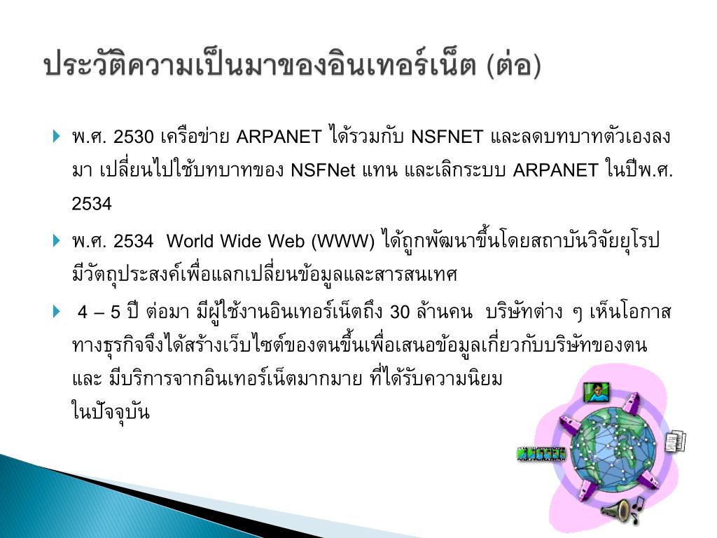 ประวัติความเป็นมาของอินเทอร์เน็ต (ต่อ) • พ.ศ. 2530 เครือข่าย ARPANET ได้รวมกับ NSFNET และลดบทบาทตัวเองลงมา เปลี่ยนไปใช้บทบาทของ NSFNet แทน และเลิกระบบ ARPANET ในปีพ.ศ. 2534 • พ.ศ. 2534 World Wide Web (WWW) ได้ถูกพัฒนาขึ้นโดยสถาบันวิจัยยุโรป มีวัตถุประสงค์เพื่อแลกเปลี่ยนข้อมูลและสารสนเทศ • 4 – 5 ปี ต่อมา มีผู้ใช้งานอินเทอร์เน็ตถึง 30 ล้านคน บริษัทต่าง ๆ เห็นโอกาสทางธุรกิจจึงได้สร้างเว็บไซต์ของตนขึ้นเพื่อเสนอข้อมูลเกี่ยวกับบริษัทของตน และ มีบริการจากอินเทอร์เน็ตมากมาย ที่ได้รับความนิยมในปัจจุบัน