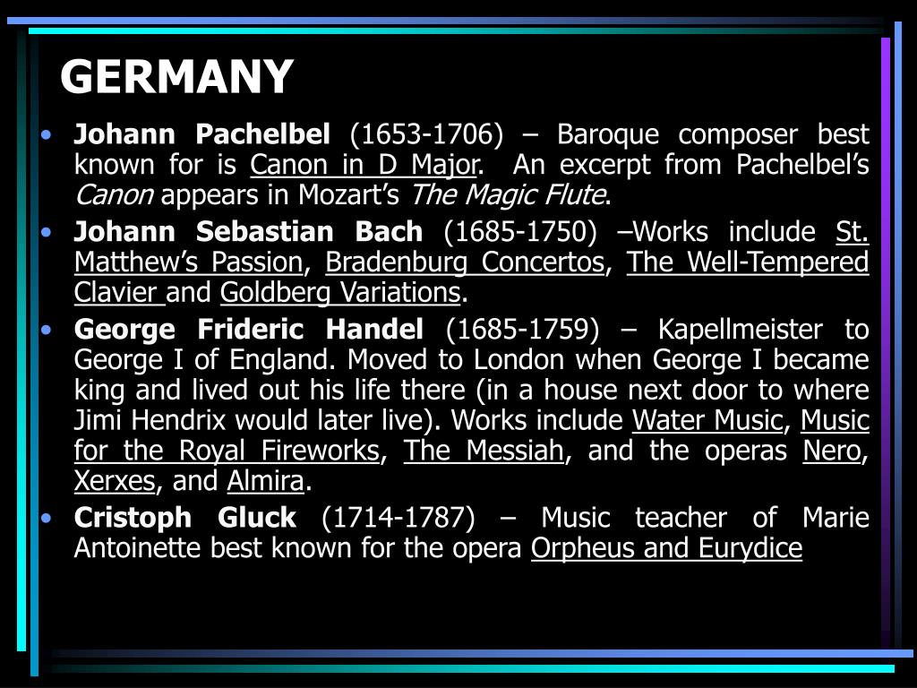 GERMANY • Johann Pachelbel (1653-1706) – Baroque composer best known for is Canon in D Major. An excerpt from Pachelbel’s Canon appears in Mozart’s The Magic Flute. • Johann Sebastian Bach (1685-1750) –Works include St. Matthew’s Passion, Bradenburg Concertos, The Well-Tempered Clavier and Goldberg Variations. • George Frideric Handel (1685-1759) – Kapellmeister to George I of England. Moved to London when George I became king and lived out his life there (in a house next door to where Jimi Hendrix would later live). Works include Water Music, Music for the Royal Fireworks, The Messiah, and the operas Nero, Xerxes, and Almira. • Cristoph Gluck (1714-1787) – Music teacher of Marie Antoinette best known for the opera Orpheus and Eurydice