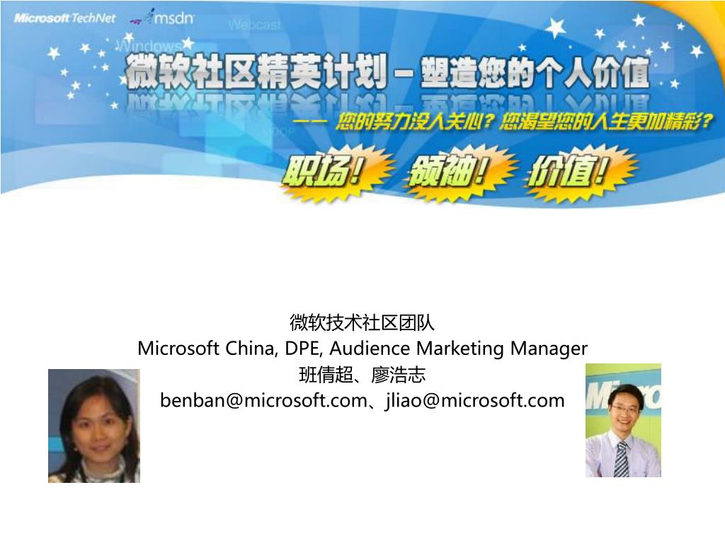 微软技术社区团队 Microsoft China, DPE, Audience Marketing Manager 班倩超、廖浩志 benban@microsoft.com、jliao@microsoft.com