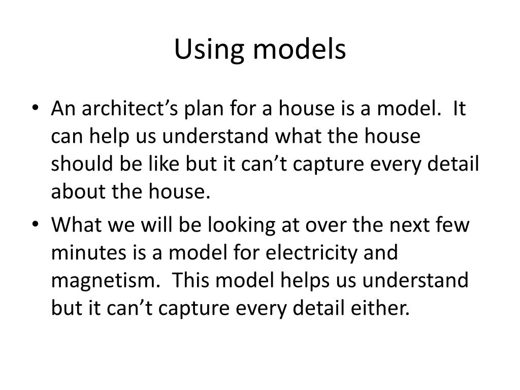 Using models • An architect’s plan for a house is a model. It can help us understand what the house should be like but it can’t capture every detail about the house. • What we will be looking at over the next few minutes is a model for electricity and magnetism. This model helps us understand but it can’t capture every detail either.