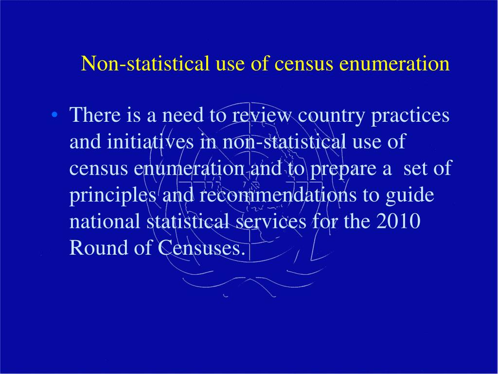 Non-statistical use of census enumeration • There is a need to review country practices and initiatives in non-statistical use of census enumeration and to prepare a set of principles and recommendations to guide national statistical services for the 2010 Round of Censuses.