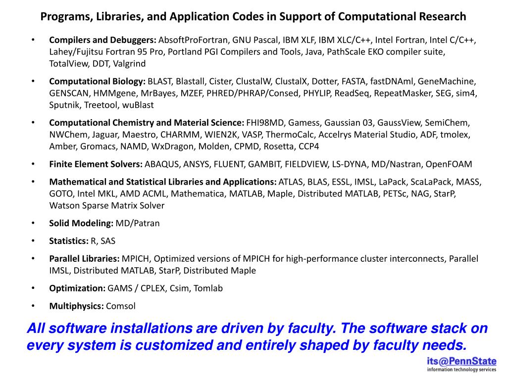 Programs, Libraries, and Application Codes in Support of Computational Research • Compilers and Debuggers: AbsoftProFortran, GNU Pascal, IBM XLF, IBM XLC/C++, Intel Fortran, Intel C/C++, Lahey/Fujitsu Fortran 95 Pro, Portland PGI Compilers and Tools, Java, PathScale EKO compiler suite, TotalView, DDT, Valgrind • Computational Biology: BLAST, Blastall, Cister, ClustalW, ClustalX, Dotter, FASTA, fastDNAml, GeneMachine, GENSCAN, HMMgene, MrBayes, MZEF, PHRED/PHRAP/Consed, PHYLIP, ReadSeq, RepeatMasker, SEG, sim4, Sputnik, Treetool, wuBlast • Computational Chemistry and Material Science: FHI98MD, Gamess, Gaussian 03, GaussView, SemiChem, NWChem, Jaguar, Maestro, CHARMM, WIEN2K, VASP, ThermoCalc, Accelrys Material Studio, ADF, tmolex, Amber, Gromacs, NAMD, WxDragon, Molden, CPMD, Rosetta, CCP4 • Finite Element Solvers: ABAQUS, ANSYS, FLUENT, GAMBIT, FIELDVIEW, LS-DYNA, MD/Nastran, OpenFOAM • Mathematical and Statistical Libraries and Applications: ATLAS, BLAS, ESSL, IMSL, LaPack, ScaLaPack, MASS, GOTO, Intel MKL, AMD ACML, Mathematica, MATLAB, Maple, Distributed MATLAB, PETSc, NAG, StarP, Watson Sparse Matrix Solver • Solid Modeling: MD/Patran • Statistics: R, SAS • Parallel Libraries: MPICH, Optimized versions of MPICH for high-performance cluster interconnects, Parallel IMSL, Distributed MATLAB, StarP, Distributed Maple • Optimization: GAMS / CPLEX, Csim, Tomlab • Multiphysics: Comsol All software installations are driven by faculty. The software stack on every system is customized and entirely shaped by faculty needs.