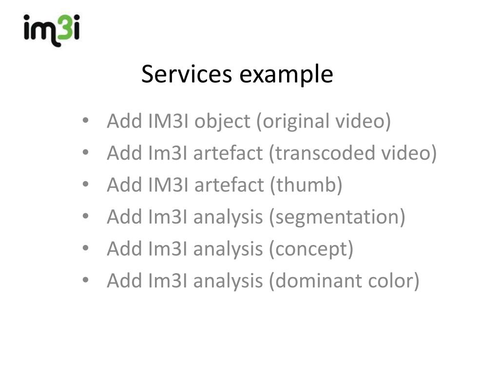 Services example Add IM3I object (original video) Add Im3I artefact (transcoded video) Add IM3I artefact (thumb) Add Im3I analysis (segmentation) Add Im3I analysis (concept) Add Im3I analysis (dominant color)
