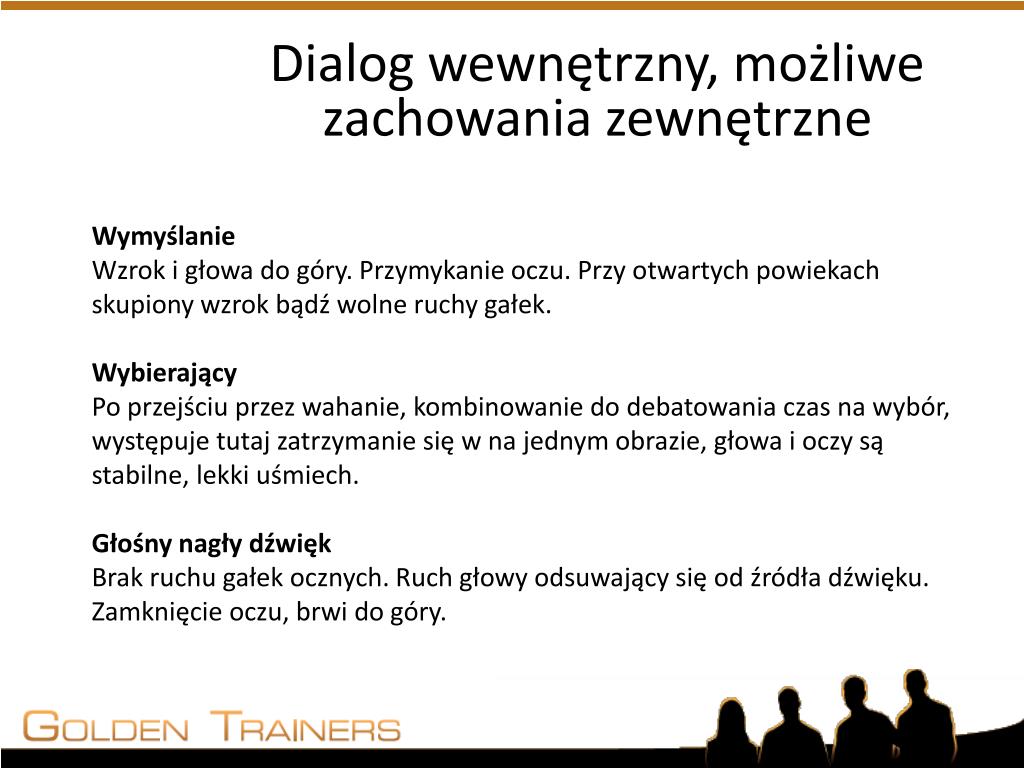 Dialog wewnętrzny, możliwe zachowania zewnętrzne WymyślanieWzrok i głowa do góry. Przymykanie oczu. Przy otwartych powiekach skupiony wzrok bądź wolne ruchy gałek.WybierającyPo przejściu przez wahanie, kombinowanie do debatowania czas na wybór, występuje tutaj zatrzymanie się w na jednym obrazie, głowa i oczy są stabilne, lekki uśmiech.Głośny nagły dźwiękBrak ruchu gałek ocznych. Ruch głowy odsuwający się od źródła dźwięku. Zamknięcie oczu, brwi do góry.